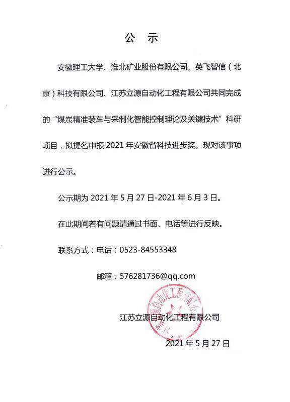 安徽理工大学、淮北矿业股份有限公司、英飞智信(北京)科技有限公司、江苏立源自动化工程有限公司共同完成的“煤炭精准装车与采制化智能控制理论及关键技术”科研项目,拟提名申报2021年安徽省科技进步奖。现对该事项进行公示。